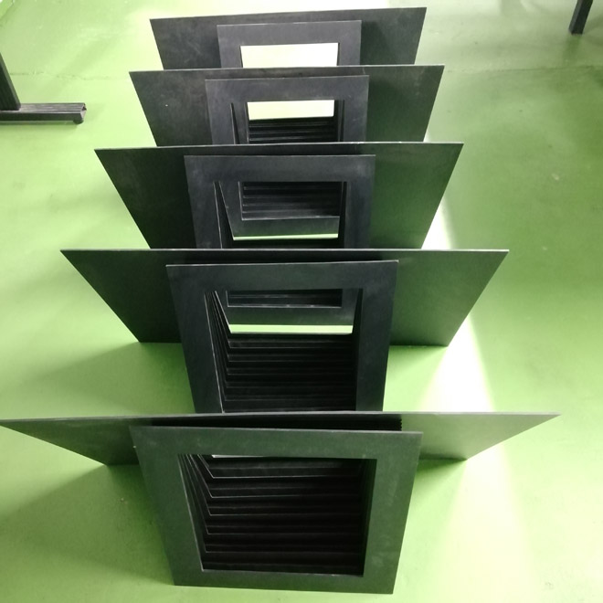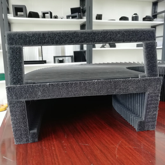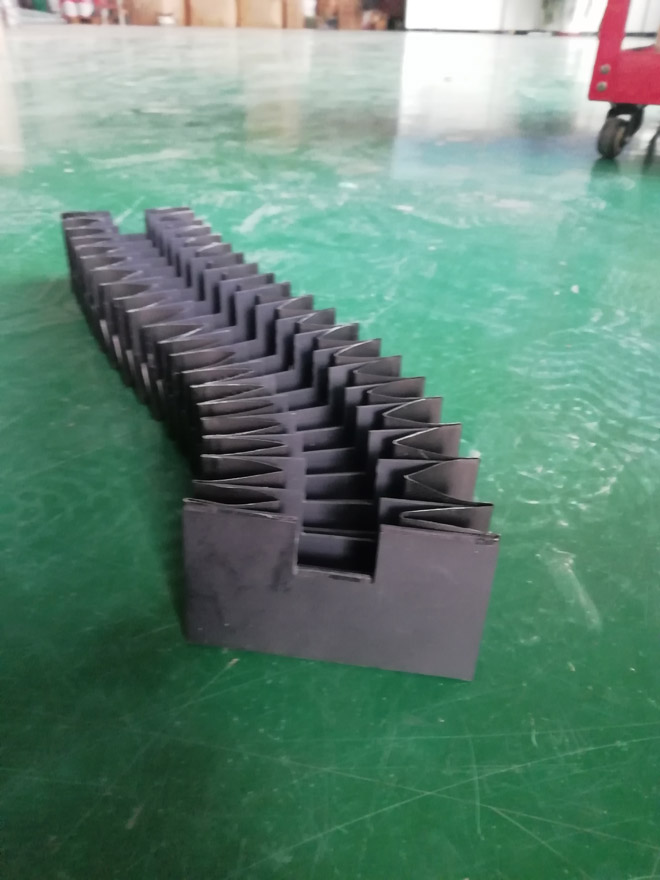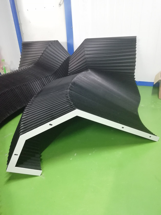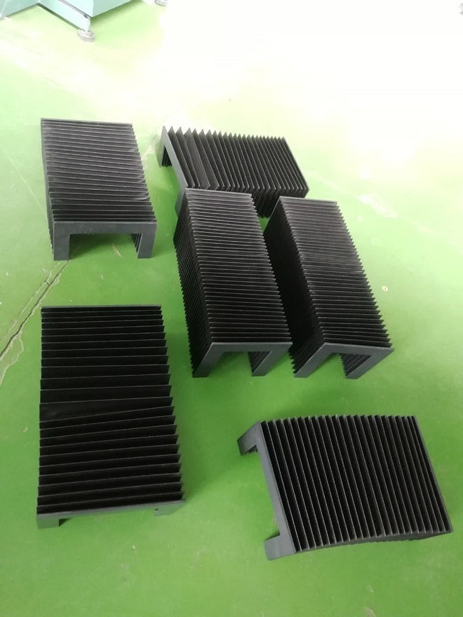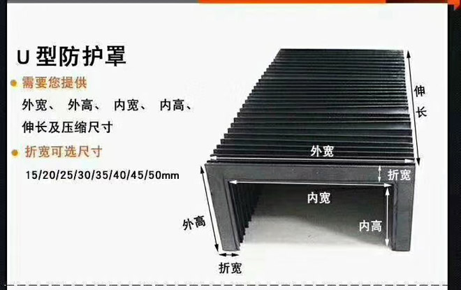 風(fēng)琴式防護(hù)罩用尼龍革、塑料織物或合成橡膠折疊、縫制或熱壓而成,內(nèi)有PVC板材支撐,可耐熱、耐油、耐冷卻液.